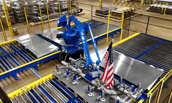 Using two robots working in tandem, BHS Robotics developed a unique solution for handling and stacking of custom steel roof panels.